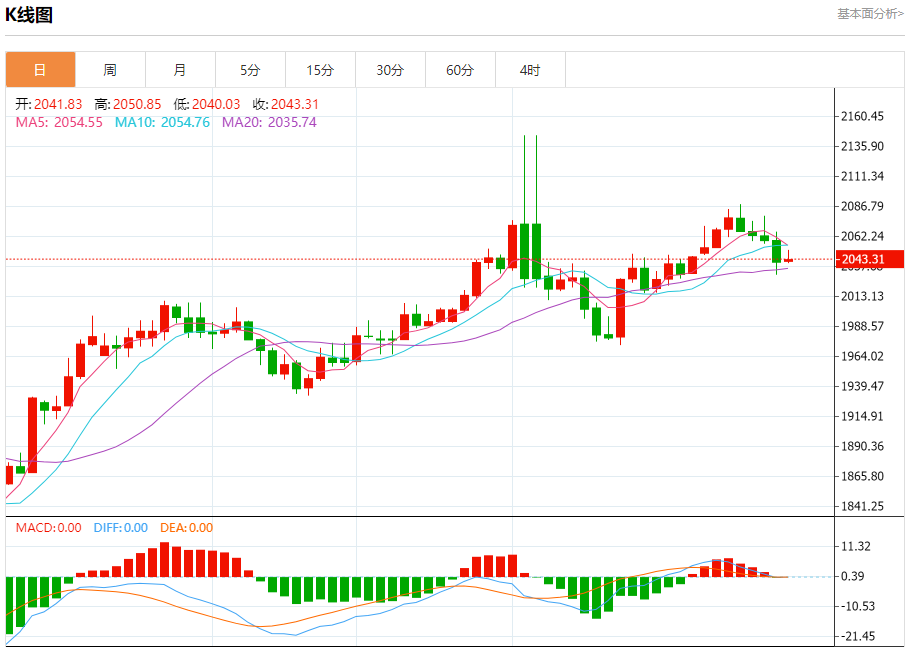 周四盘中,现货黄金报2043.90,涨幅0.13%。