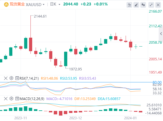 金价在从2088美元(12月28日高点) 开启连续四天的回调,最低触及2030美元(1973美元/2088美元上升区间的50%回撤位) 。这表明金价仍处于较大上升趋势中的健康回调中,技术面仍然看涨,并目金价继续受益于美联储将在2024年降息的广泛预期。然而,由于美联储降息前景存在重人不确定性,对3月份将开始降息的预期逐渐减弱,这继续对金价构成阳力,并使其面临下行风险。