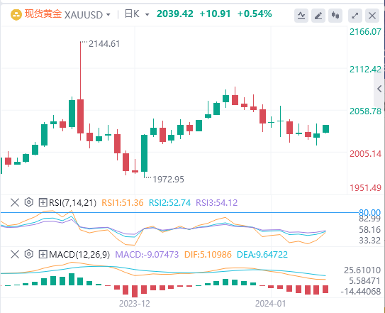 黄金周五走高,目前每日价格为2039.42,轻松高于200日移动均线1963.17和50日移动均线2014.72和次要支撑位2009.00形成的支撑群。此外,市场周四在50日移动均线处获得支撑,进一步证实了其重要性。
