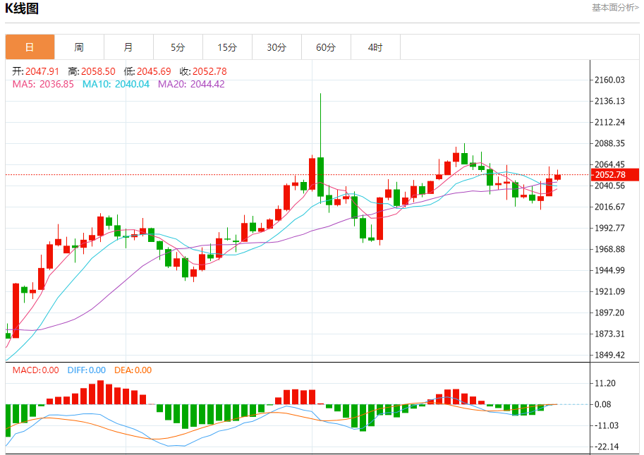 周一盘中,现货黄金报2052.74,涨幅0.20%。