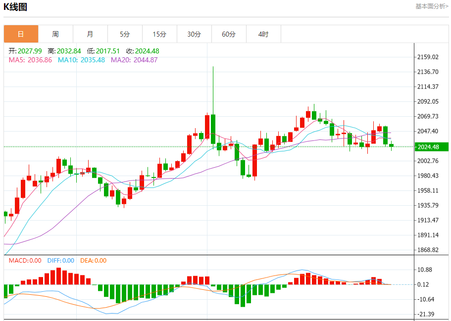 周三盘中,现货黄金报2024.06,跌幅0.20%。