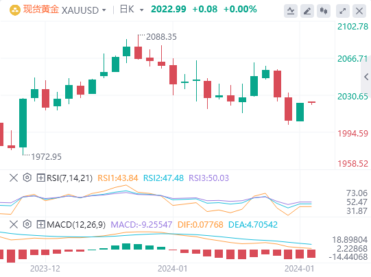 周四,现货黄金有所反弹,并在美盘时段接连收复两大整数关口,最终收涨0.85%,报2023.23美元/盎司。截至目前,黄金报价2022.99。
