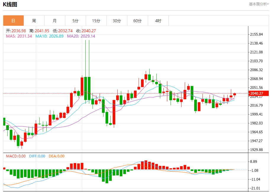 周三盘中,现货黄金报2040.19,涨幅0.17%。