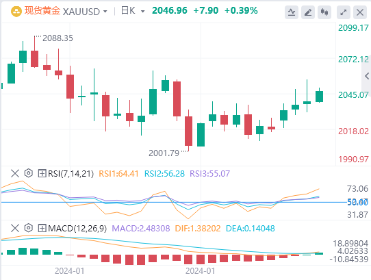 由于市场的降息预期在“小非农”数据和鲍威尔“放鹰”的影响下坐上过山车,现货黄金盘中惊现倒V反转,一度刷新日低至2030.74,较日高跌近25美元,尾盘有所反弹,最终勉强收涨0.12%,报2039.32美元/盎司。截至目前,黄金报价2046.96。