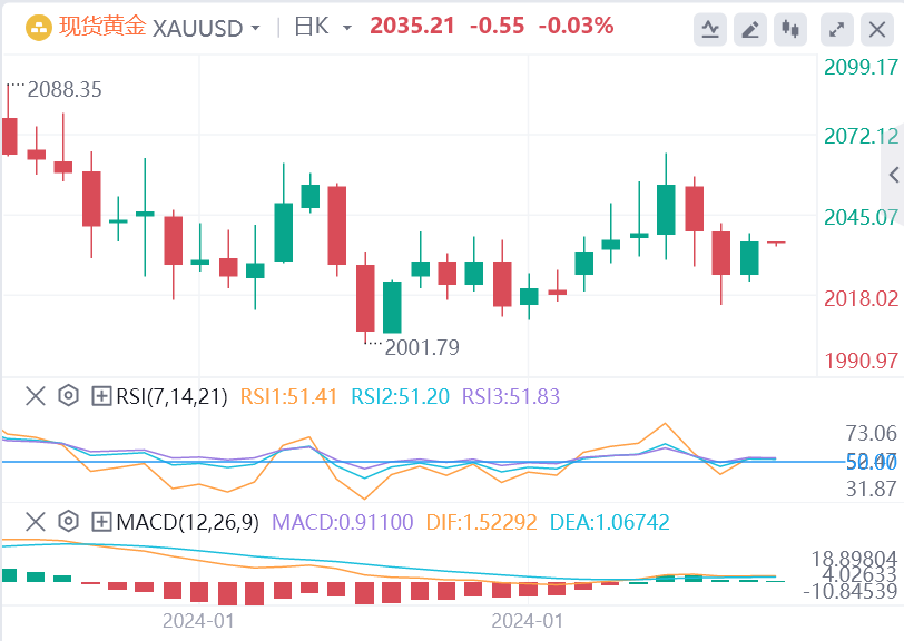 美元需求减弱,现货黄金周一收复失地。金价接近日线高点2038.17美元,收复了过去几天的部分失地。在全球央行行长们对投资者收紧货币政策的预期泼冷水之后,金融市场都在关注延迟降息。本周二,澳储行(RBA)也加入了谨慎立场的行列,决策者们决定为在条件许可时进一步加息敞开大门。