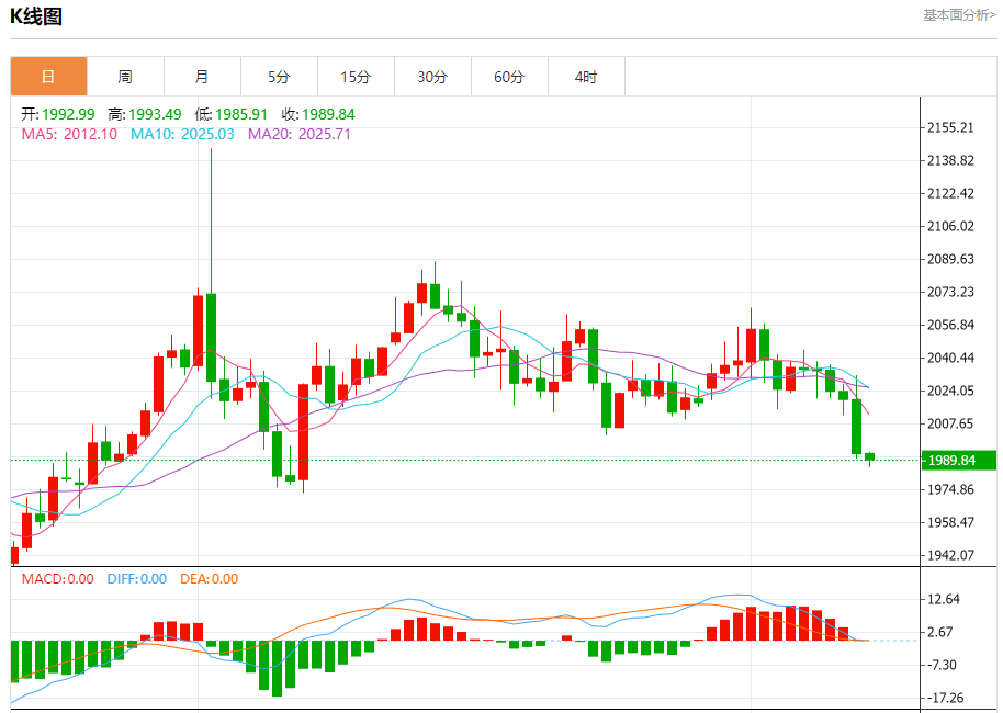 周三盘中,现货黄金报1989.85,跌幅0.15%。