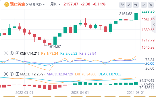 因鲍威尔言论导致降息押注增加、央行持续采购,和地缘政治升级导致避险情绪的加强,现货黄金屡创新高,斩获7连阳,盘中一度上破2164美元/盎司,最终收涨0.55%,报2160.02美元/盎司;截至目前,黄金报价2157.47。