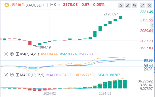 金价的近期技术前景大致保持不变,日线图上的14天相对强弱指数(RSI)显示,在极度超买的情况下,金价可能会出现修正。如果修正势头增强,黄金卖家可能会测试前一天低点2154美元的初步支撑位。下一个支撑位在2146美元,这里是周四的低点,也是近期从2月14日低点1,984美元反弹至历史高点2195美元的23.6%斐波那契回调(Fibo)位。