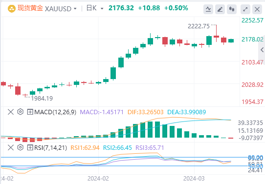 黄金从技术面上讲,前景尚不明朗,但从基本面上说,形势仍然是看涨的。在上周四的早盘交易中,黄金价格飙升至2222美元,原因是流动性不足,以及触发了止损指令,令市场上的空头头寸被洗出。周四全天,2200美元上方的企稳对许多人来说颇具吸引力。但到目前为止的技术面信号在日线图上呈现了一个相当不明确的画面。在看涨方面,黄金突破之前高点的能力证实了金价伸至2300美元的可能性,此处是2月29日-3月8日涨势的161.8%延伸位,此前的修正盘整在76.4%回撤位。在盘整之后创造新高是一个看涨的信号。