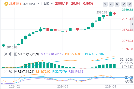 黄金日线图显示,相对强弱指数(RSI)仍远高于70,表明近期黄金在技术上仍超买。如果金价未能达到新高并开始技术修正,那么2-4月上升趋势23.6%的斐波那契回撤位2230美元可能被视为首个看跌目标,接下来的看空目标位于2200美元/盎司(20日简单移动平均线)。