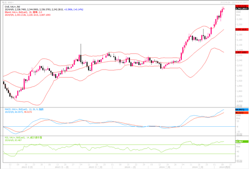 周一(4月8日),金价连续第七个交易日创下纪录新高,当日现货金上涨0.3%收盘在每盎司2,336.39美元,稍早创下了2,353.79美元的纪录新高。