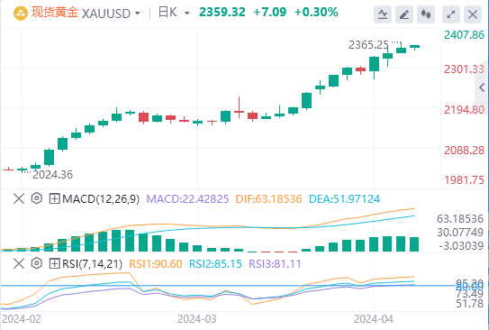 黄金买家继续摆脱14天相对强弱指数(RSI)极度超买的状况,周二在2365美元再次创下历史新高。如果金价因美国CPI报告升温而出现回调,那么之前的历史高点2,331美元将面临考验。金价回调的延伸可能会测试4月4日的高点2,305美元,跌破后将测试4月5日的低点2,268美元。