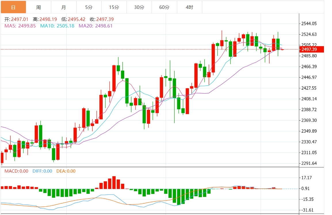 技术上,金价已经跌破短期支撑位2500美元/盎司(20日简单移动平均线,上升通道中点)。假如金价维持在该位下方,并确认其为阻力位,那么2440美元/盎司(50日移动均线)可能被视为下一个支撑位,接下来的支撑位于2400美元/盎司(上升通道的下沿)。