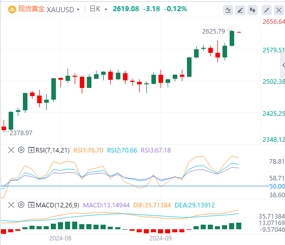 上周五,现货黄金维持强劲涨势,盘中将历史新高 刷新至2625美元/盎司,截至目前,黄金报价2619.08。
