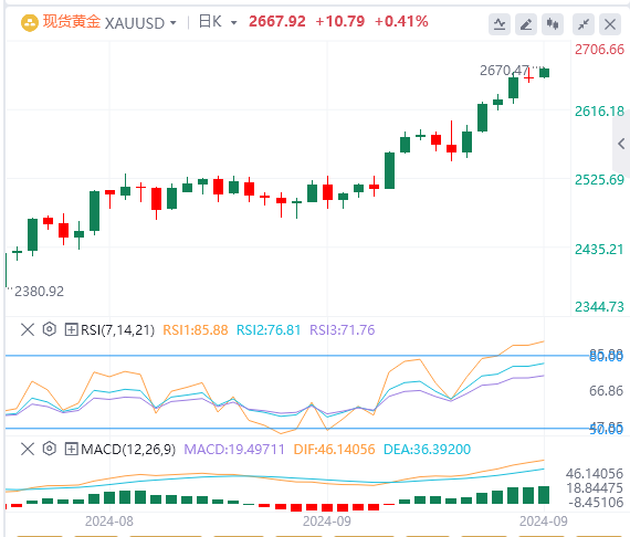 金价略低于周三创下的2,670美元的历史高点。中国人民银行(PBoC)、瑞典央行和捷克共和国中央银行最近几天决定大幅降息,这对黄金有利,因为它降低了持有非支付利息资产的机会成本,使其对投资者更具吸引力。