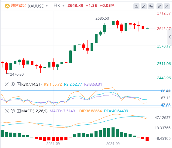 周一,现货黄金延续回调,录得日线四连阴,盘中最低触及2637.71美元/盎司,截至目前,黄金报价2643.88。