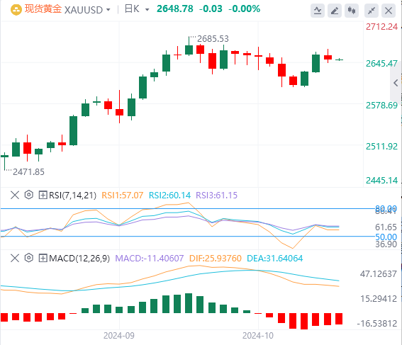 技术面上,现货黄金上周五突破了2645.01美元,这是关键的短期支撑位。若价格维持在此处之上,则仍有上涨空间,可能推向2685.64美元历史高点。然而,若未能维持在此处之上,则可能回落至2605.28-2616.25美元支撑区。