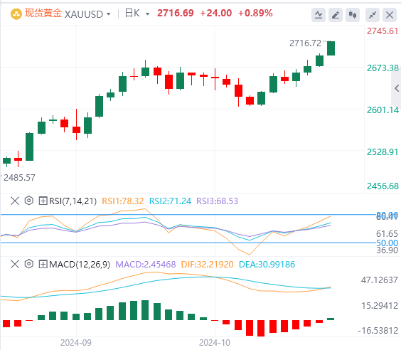 然而,相对强弱指数(RSI)超买,建议多头持有者不要增加多头头寸,因为回调风险增加。如果RSI收于中性区域,这将是多头持有者平仓并开空头的信号,因为更深入的修正正在进行中。支撑位在2700美元(关键水平)和2685美元(9月高点)。