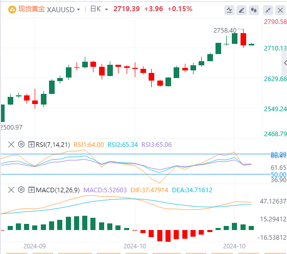 根据美元指数的数据,随着美国国债收益率攀升,金价周三从历史高点2758美元暴跌,而美元刷新了两个月高点。在撰写本文时,黄金/美元交易价格为2716美元,下跌超过1%。