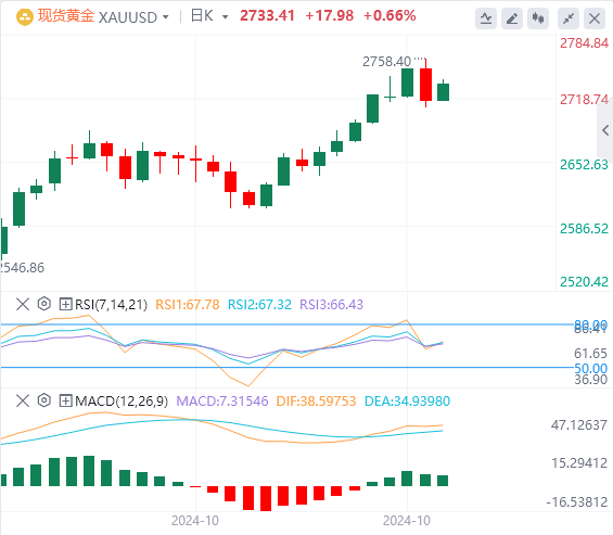 目前,金价徘徊在2733美元附近,随着政治和经济不确定性缓和进一步下跌,金价企稳。