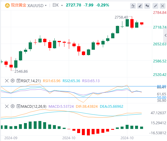 金价再度转跌测试2723美元(阻力转支撑位,自10月低点2604美元至历史新高2759美元之间涨势的23.6%回档位)。如果日K线收盘无法守住该位,金价可能加速跌向38.2%回档位2700美元。
