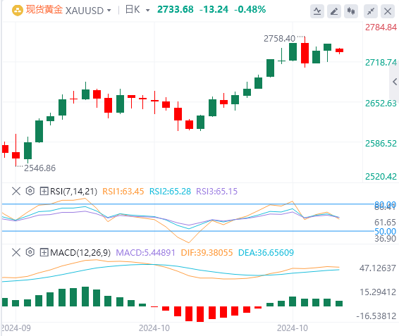 上周五,现货黄金在美盘前大幅回升,最终收涨0.41%,报2746.92美元/盎司。周一,现货黄金开盘跳空低开15美元。截至目前,黄金报价2733.68。