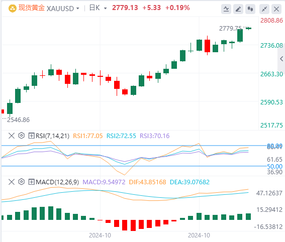 周二,现货黄金将历史高点刷新至2774.69美元,截至目前,黄金报价2779.13。