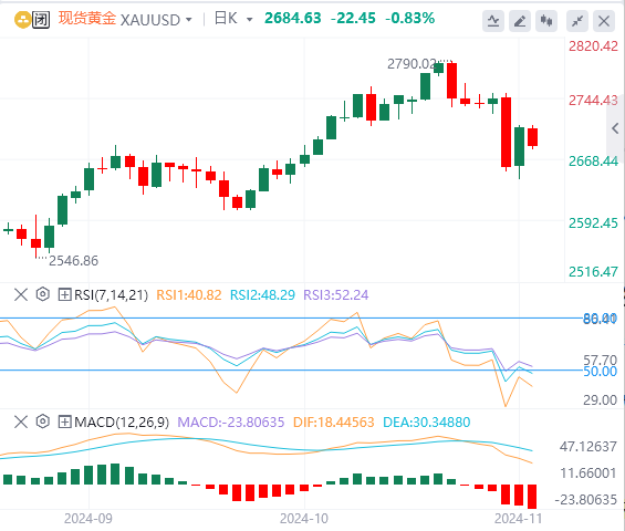 周三亚洲交易时段,美元开始对其竞争对手走强,并导致黄金转而南下。唐纳德-特朗普(DonaldTrump)夺回战场州佐治亚州和北卡罗来纳州的消息引发美国国债收益率上扬,进一步打压了黄金价格。在欧洲早盘时段,新闻媒体开始称宾夕法尼亚州支持特朗普,这个摇摆州被普遍认为是卡马拉-哈里斯扭转选情的唯一机会,几乎正式确认了特朗普的胜出。共和党也获得了参议院的多数席位,并有望控制众议院,这促使美国收益率和美元再次走高。黄金跌破2,700美元,单日下跌3%,创下今年最大单日跌幅。