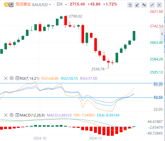 XAU/USD周五延续其涨势,攀升至两周高点,突破2700美元。据报道,俄罗斯将波兰的一个美国导弹基地确定为优先目标,加剧了俄罗斯与西方国家之间危机加深的担忧。当天晚些时候,美国数据显示,标普全球综合PMI在11月的初值从10月的54.1上升至55.3,显示美国私营部门的商业活动继续以加速的速度扩展。评估调查结果时,标普全球市场情报首席商业经济学家克里斯·威廉姆森表示:“即将上任的政府采取更有利于商业的政策以及降息的前景,推动了更大的乐观情绪,从而帮助11月的产出和订单流入增加。”黄金在即时反应中回落至2700美元以下,因为乐观的PMI数据帮助美元走强。