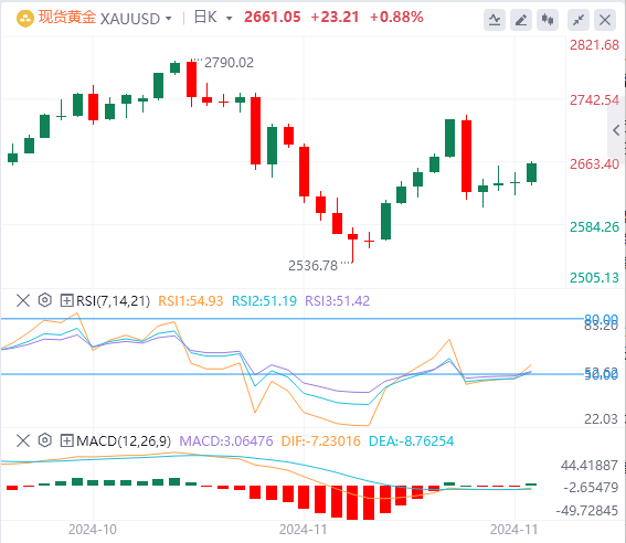 反之,如果持续突破50日均线(2670美元),则可能打开上行空间,升至2700美元水平。再往北,11月25日的高点2721美元将受到考验。