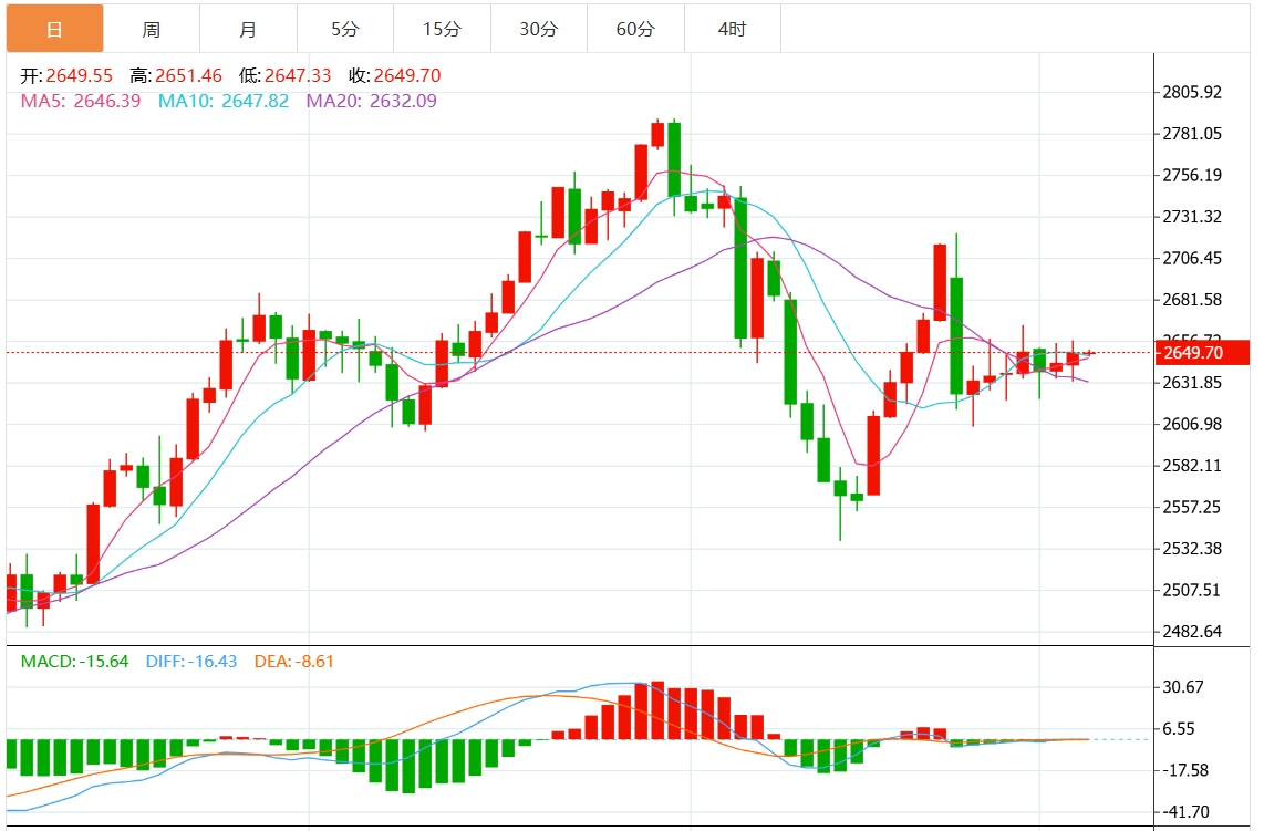 金价仍有上行倾向,但在过去七天内基本在2600-2650美元/盎司之间徘徊。金价上行走势受到50日简单移动平均线(SMA)2668美元/盎司的限制;如果突破该位,就会瞄准2700美元/盎司。