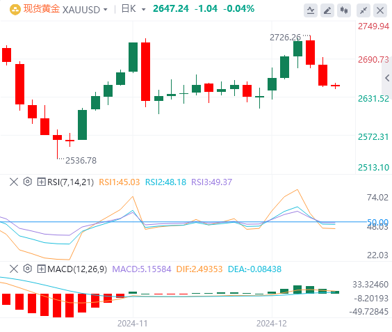 由于美元保持坚挺,上周五现货黄金进一步远离五 周高点,失守2650美元大关,截至目前,黄金报价2647.24。