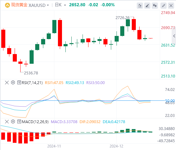 周一,现货黄金总体上先涨后跌,盘中最高触及2664美元,随后抹去部分涨幅,截至目前,黄金报价2652.80。