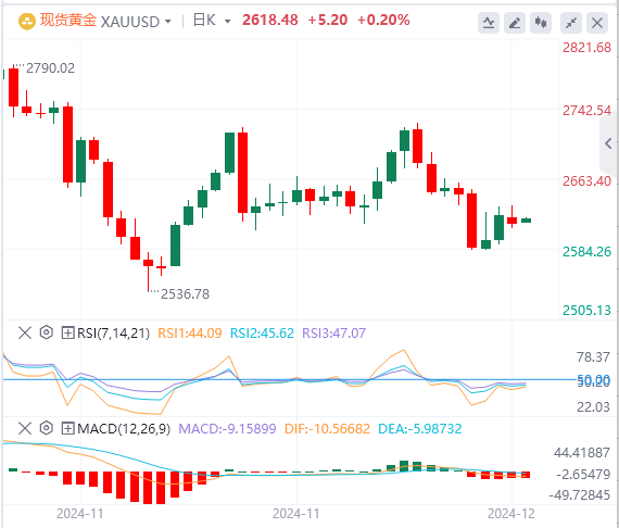 受美元和美债收益率回升的拖累,现货黄金小幅走低,最低触及2608.08美元/盎司,截至目前,黄金报价2618.48。