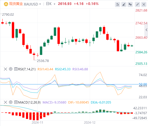 现货黄金在假日清淡的交易中企稳,于接近10美元的区间内窄幅波动,最终收涨0.17%,报2617.27美元/盎司。截至目前,黄金报价2616.93。