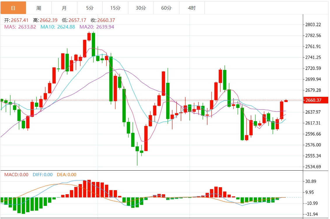 从技术面来看,MACD金叉运行,KDJ金叉运行,布林线轨道收口后接近水平运行,金价周四顶破了布林线中轨关键阻力,近两周高点阻力也被顶破,目前正试探55日均线2663.60附近阻力,如果向上突破,则金价后市有望进一步上探布林线上轨2698.17附近阻力,也可以参考2700关口。