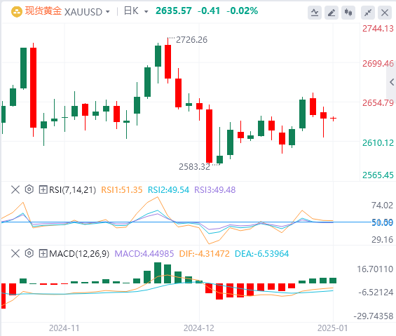 出于对特朗普议程的担忧,美元指数盘中走强,黄金在2024年收于2600美元至2620美元之间。尽管如此,近期黄金突破了上述震荡区间的上沿阻力,这也打开了黄金将交投区间上移至2630美元至2650美元的大门,而50日简单移动平均线(SMA)在2652美元附近平稳前行。