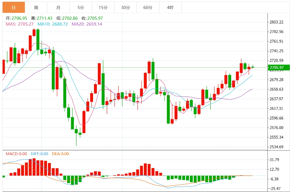 技术面来看,日线级别均线接近多头排列,金价目前有望继续冲高,并向12月12日触及的逾两个月高点2726.05附近阻力发起冲击;下方留意10日均线2689.23附近支撑,若意外失守该位置,则削弱看涨信号。