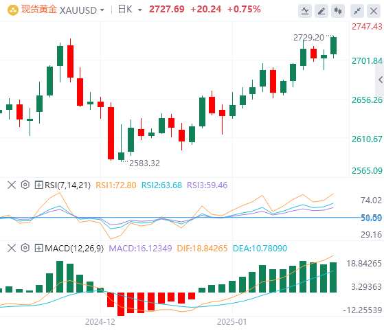 金价在美元走软的支撑下走高,市场评估美国总统特朗普就职后第二任期内的政策会对经济造成何种影响。现货金收涨0.24%,至每盎司2708美元附近。