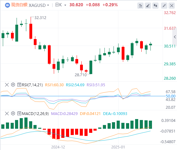 白银于28.75一线企稳,形成W底形态结构,并逐步站稳颈线位29.90一线,保持着震荡上行节奏。同时逐步打破前期下行趋势压力。从下方MACD指标来看,量能虽然处于零轴之下,但表现出缩量调整。所以,操作上建议逢低尝试做多思路为主。