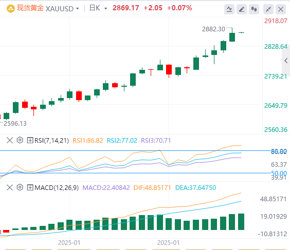 受美元和美债收益率下跌以及贸易担忧带来的避险需求推动,国际金价续创新高,现货黄金盘中突破2880美元/盎司,截至目前,黄金报价2869.17。