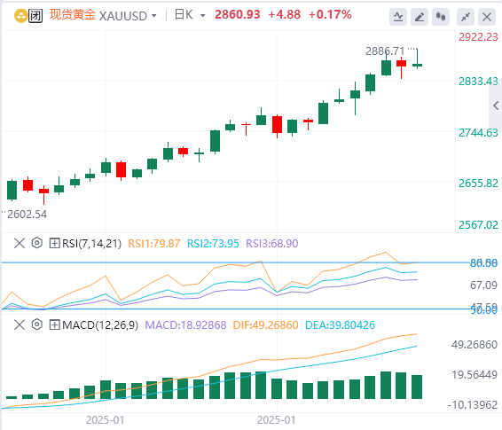现货黄金本周收盘大涨2.2%,报2860.59美元/盎司;金价周五盘中最高触及2886.83美元/盎司,创下历史新高。