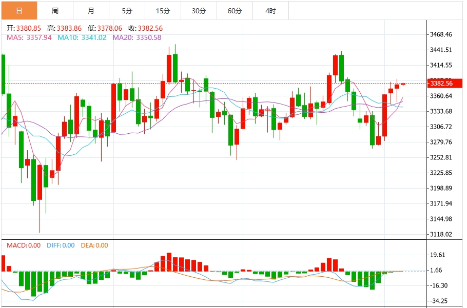日线图上的相对强弱指数(RSI)位于55左右的中性区域,表明缺乏明确的动能。与此同时,MACD 指标中,DIFF上穿DEA形成金叉,且MACD柱为正,显示多头力量在积累,不过整体数值不高,上涨动能有待进一步释放,若金叉持续且柱体放大,对多头有利。上行方面,如果多头能够收复已突破的三角形底部,并果断推高至3380美元上方,则有可能迈向3450美元,甚至可能重新触及历史高点。