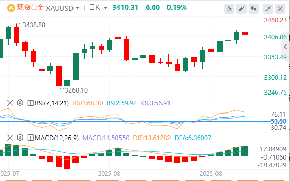 布林带上边界3425美元是黄金的直接阻力位。持续高于该水平的交易可能会使黄金升至3439美元,即7月23日的高点。下一个值得关注的上行目标是3500美元,即4月22日的心理水平和高点。