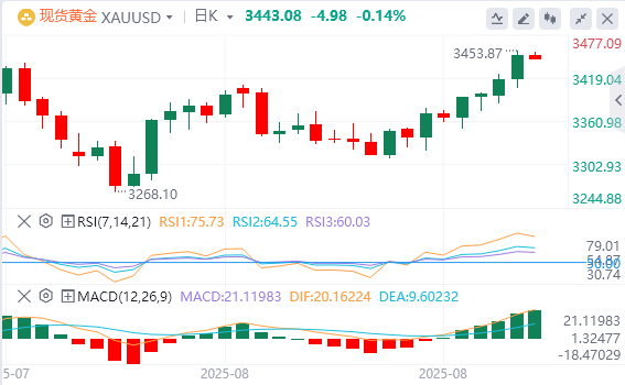 此前公布的通胀数据显示,个人消费支出(PCE)物价指数环比上涨0.2%,符合市场预期,同比上涨2.6%。核心PCE小幅升至2.9%,但市场对此反应平淡。交易员纷纷加大对美联储9月降息25个基点的押注,降息概率从8月初的63%飙升至近89%。受此影响,黄金价格跃升至关键阻力位3439.04美元和3451.53美元上方,历史最高点3500.20美元也近在咫尺。