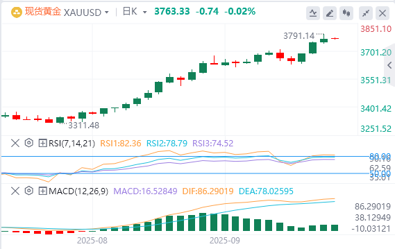 根据CMEFedWatch工具,市场预计美联储将再降息两次25个基点(bps),分别在10月和12月降息一次,可能性分别为90%和73%。较低的利率可能会降低持有黄金的机会成本,从而支撑无收益贵金属。