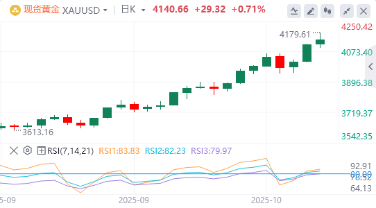 从技术角度来看,过去三周左右的近期上涨一直沿着向上倾斜的趋势线支撑。此外,隔夜突破4055-4060美元水平阻力位以及随后突破4100美元关口的强势再次证实了黄金/美元货币对的近期积极前景。然而,每日相对强弱指数(RSI)显示出极度超买的状况,在准备进一步升值之前需要谨慎行事。