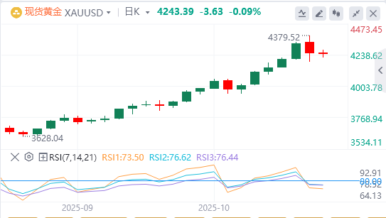国际现货黄金创下4379美元的历史新高后跳水近130美元,最终收跌1.75%,截至目前,黄金报价4243.39。