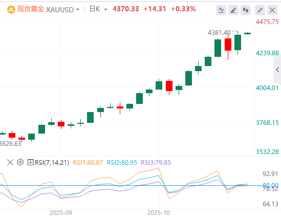 受美联储将进一步降息的预期和持续的避险需求提振,现货黄金突破上周五的纪录高位,触及4381.4美元/盎司,截至目前,黄金报价4370.33。