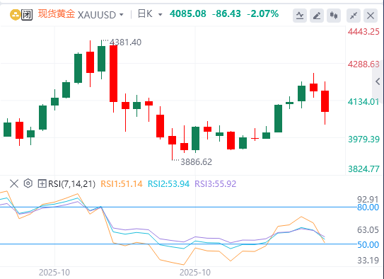 从3310美元低点到4380美元高点测量的38.2%回撤位在3975美元,提供初步支撑,50%回撤位在3845美元以下。价格保持在3975美元之上可维持看涨偏向,若收盘低于该水平,修正阶段可能延续至3845美元。趋势支撑也出现在接近3938.26美元的50日SMA。若价格持续在短期均线之上获得买盘支撑,将改善动能,为进一步上涨创造空间。